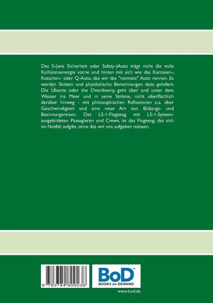 Das S-(wie Sicherheit oder Safety-)Auto trägt nicht die volle Kollisionsenergie vorne und hinten mit sich wie das Karossen-, Kutschen- oder Q-Auto, das wir das "normale" Auto nennen. Es werden Skizzen und physikalische Berechnungen dazu geliefert. Die Übunte oder the Overdowny, geht über und unter dem Wasser ins Meer und in seine Ströme, nicht oberflächlich darüber hinweg - mit philosophischen Reflexionen u.a. über Geschwindigkeit und eine neue Art von Bildungs- und Besinnungsreisen. Das LS-1-Flugzeug mit LS-1-System-ausgebildeten Passagieren und Crews, ist das Flugzeug, das sich im Notfall aufgibt, ohne das wir uns aufgeben müssen.