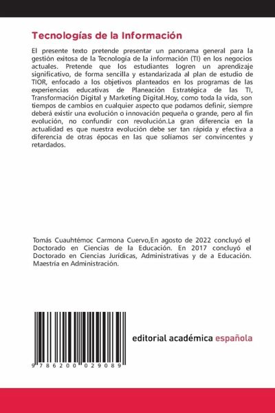 El presente texto pretende presentar un panorama general para la gestión exitosa de la Tecnología de la información (TI) en los negocios actuales. Pretende que los estudiantes logren un aprendizaje significativo, de forma sencilla y estandarizada al plan de estudio de TIOR, enfocado a los objetivos planteados en los programas de las experiencias educativas de Planeación Estratégica de las TI, Transformación Digital y Marketing Digital.Hoy, como toda la vida, son tiempos de cambios en cualquier aspecto que podamos definir, siempre deberá existir una evolución o innovación pequeña o grande, pero al fin evolución, no confundir con revolución.La gran diferencia en la actualidad es que nuestra evolución debe ser tan rápida y efectiva a diferencia de otras épocas en las que solíamos ser convincentes y retardados.