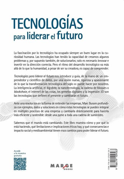 La fascinación por lo tecnológico ha ocupado siempre un buen lugar en la curiosidad humana. Las tecnologías han tenido la capacidad de crearnos algunos problemas y, por supuesto también, de solucionarlos; solo es necesario innovar e invertir en la dirección correcta. Pero el ritmo del desarrollo tecnológico va más allá de lo que la humanidad, a pesar de ser su creadora, es capaz de comprender. Tecnologías para liderar el futuro nos introduce y guía, de la mano de un emprendedor y científico de datos, por una visión nueva, rigurosa y apasionante de lo que la transformación tecnológica del siglo xxi puede hacer por nosotros. La inteligencia artificial, el big data, la nanotecnología, la cadena de bloques o blockchain, el internet de las cosas, los gemelos digitales y la impresión 3D son las tecnologías que definen el presente y cambiarán el futuro. Ante una revolución en la forma de entender las empresas, Marc Busom profundiza con ejemplos, datos y soluciones en cómo estas tecnologías se pueden integrar en múltiples procesos de una empresa y cambiarla drásticamente para hacerla más eficiente y sostenible: desde una pyme a toda una cadena de suministro. Sabemos que el mundo está cambiando. Este libro muestra cómo y por qué lo está haciendo, qué limitaciones e implicaciones éticas hay, y qué consecuencias e impacto social y medioambiental tienen esos cambios para poder liderar el futuro.