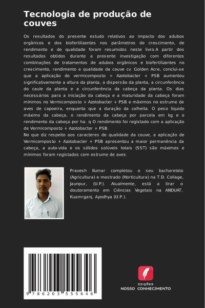Os resultados do presente estudo relativos ao impacto dos adubos orgânicos e dos biofertilizantes nos parâmetros de crescimento, de rendimento e de qualidade foram resumidos neste livro.A partir dos resultados obtidos durante a presente investigação com diferentes combinações de tratamentos de adubos orgânicos e biofertilizantes no crescimento, rendimento e qualidade da couve cv. Golden Acre, conclui-se que a aplicação de vermicomposto + Azotobacter + PSB aumentou significativamente a altura da planta, a dispersão da planta, a circunferência do caule da planta e a circunferência da cabeça da planta. Os dias necessários para a iniciação da cabeça e a maturidade da cabeça foram mínimos no Vermicomposto + Azotobacter + PSB e máximos no estrume de aves de capoeira, enquanto que a duração da colheita. O peso líquido máximo da cabeça, o rendimento da cabeça por parcela em kg e o rendimento da cabeça por ha. q O rendimento foi registado com a aplicação de Vermicomposto + Azotobacter + PSB.No que diz respeito aos caracteres de qualidade da couve, a aplicação de Vermicomposto + Azotobacter + PSB apresentou a maior permanência da cabeça, a auto-vida e os sólidos solúveis totais (SST) são máximos e mínimos foram registados com estrume de aves.
