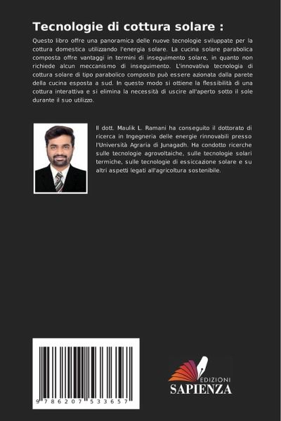 Questo libro offre una panoramica delle nuove tecnologie sviluppate per la cottura domestica utilizzando l'energia solare. La cucina solare parabolica composta offre vantaggi in termini di inseguimento solare, in quanto non richiede alcun meccanismo di inseguimento. L'innovativa tecnologia di cottura solare di tipo parabolico composto può essere azionata dalla parete della cucina esposta a sud. In questo modo si ottiene la flessibilità di una cottura interattiva e si elimina la necessità di uscire all'aperto sotto il sole durante il suo utilizzo.