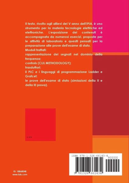 Il testo di tecnologie elettriche ed elettroniche è rivolto agli allievi del quinto anno dell'IPIA. I moduli trattati sono: dominio della frequenza, diagrammi di Bode, controls (CLIL methodology), trasduttori e linguaggi (Ladder e Grafcet)per il PLC. Nel volume vi sono numerose proposte per attività pratiche di laboratorio (in particolare montaggio su breadboard).