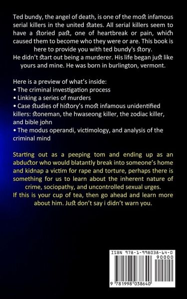 Ted bundy, the angel of death, is one of the most infamous serial killers in the united states. All serial killers seem to have a storied past, one of heartbreak or pain, which caused them to become who they were or are. This book is here to provide you with ted bundy's story. He didn't start out being a murderer. His life began just like yours and mine. He was born in burlington, vermont. Here is a preview of what's inside:The criminal investigation process Linking a series of murders Case studies of history's most infamous unidentified killers: stoneman, the hwaseong killer, the zodiac killer, and bible john The modus operandi, victimology, and analysis of the criminal mind Starting out as a peeping tom and ending up as an abductor who would blatantly break into someone's home and kidnap a victim for rape and torture, perhaps there is something for us to learn about the inherent nature of crime, sociopathy, and uncontrolled sexual urges. If this is your cup of tea, then go ahead and learn more about him. Just don't say i didn't warn you.