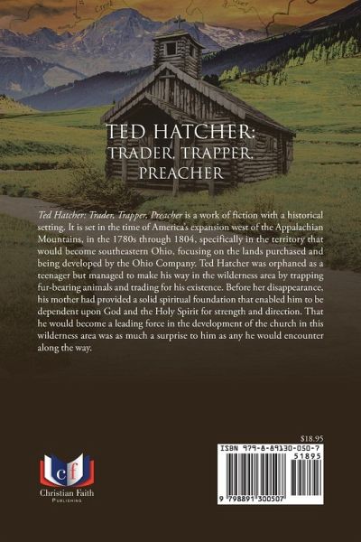 Ted Hatcher: Trader, Trapper, Preacher is a work of fiction with a historical setting. It is set in the time of America's expansion west of the Appalachian Mountains, in the 1780s through 1804, specifically in the territory that would become southeastern Ohio, focusing on the lands purchased and being developed by the Ohio Company. Ted Hatcher was orphaned as a teenager but managed to make his way in the wilderness area by trapping fur-bearing animals and trading for his existence. Before her disappearance, his mother had provided a solid spiritual foundation that enabled him to be dependent upon God and the Holy Spirit for strength and direction. That he would become a leading force in the development of the church in this wilderness area was as much a surprise to him as any he would encounter along the way.