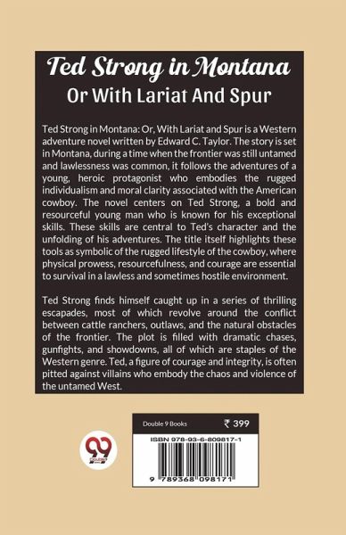 Ted Strong in Montana: Or, With Lariat and Spur is a Western adventure novel written by Edward C. Taylor. The story is set in Montana, during a time when the frontier was still untamed and lawlessness was common, it follows the adventures of a young, heroic protagonist who embodies the rugged individualism and moral clarity associated with the American cowboy. The novel centers on Ted Strong, a bold and resourceful young man who is known for his exceptional skills. These skills are central to Ted's character and the unfolding of his adventures. The title itself highlights these tools as symbolic of the rugged lifestyle of the cowboy, where physical prowess, resourcefulness, and courage are essential to survival in a lawless and sometimes hostile environment. Ted Strong finds himself caught up in a series of thrilling escapades, most of which revolve around the conflict between cattle ranchers, outlaws, and the natural obstacles of the frontier. The plot is filled with dramatic chases, gunfights, and showdowns, all of which are staples of the Western genre. Ted, a figure of courage and integrity, is often pitted against villains who embody the chaos and violence of the untamed West.