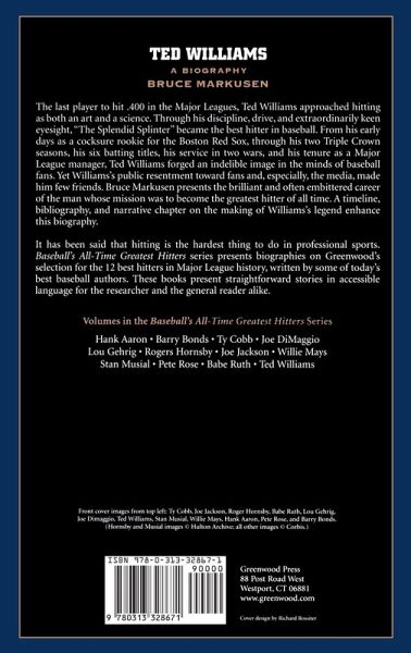 The last player to hit .400 in the Major Leagues, Ted Williams approached hitting as both an art and a science. Through his discipline, drive, and extraordinarily keen eyesight, "The Splendid Splinter" became the best hitter in baseball. From his early days as a cocksure rookie for the Boston Red Sox, through his two Triple Crown seasons, six batting titles, his service in two wars, and his tenure as a Major League manager, Ted Williams forged an indelible image in the minds of baseball fans. Yet Williams's public resentment toward fans and, especially, the media, made him few friends. Bruce Markusen presents the brilliant and often embittered career of the man whose mission was to become the greatest hitter of all time. A timeline, bibliography, and narrative chapter on the making of Williams' legend enhance this biography. It has been said that hitting is the hardest thing to do in professional sports. Baseball's All-Time Greatest Hitters series presents biographies on Greenwood's selection for the twelve best hitters in Major League history, written by some of today's best baseball authors. These books present straight forward stories in accessible language for the high school researcher and the general reader alike.
