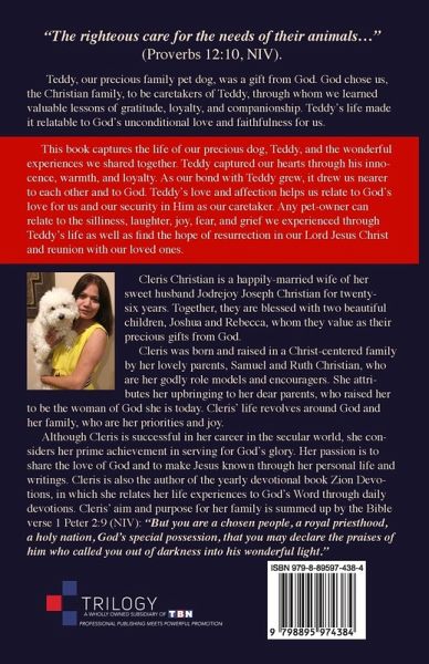 "The righteous care for the needs of their animals..." (Proverbs 12:10, NIV). Teddy, our precious family pet dog, was a gift from God. God chose us, the Christian family, to be caretakers of Teddy, through whom we learned valuable lessons of gratitude, loyalty, and companionship. Teddy's life made it relatable to God's unconditional love and faithfulness for us. This book captures the life of our precious dog, Teddy, and the wonderful experiences we shared together. Teddy captured our hearts through his innocence, warmth, and loyalty. As our bond with Teddy grew, it drew us nearer to each other and to God. Teddy's love and affection helps us relate to God's love for us and our security in Him as our caretaker. Any pet-owner can relate to the silliness, laughter, joy, fear, and grief we experienced through Teddy's life as well as find the hope of resurrection in our Lord Jesus Christ and reunion with our loved ones.