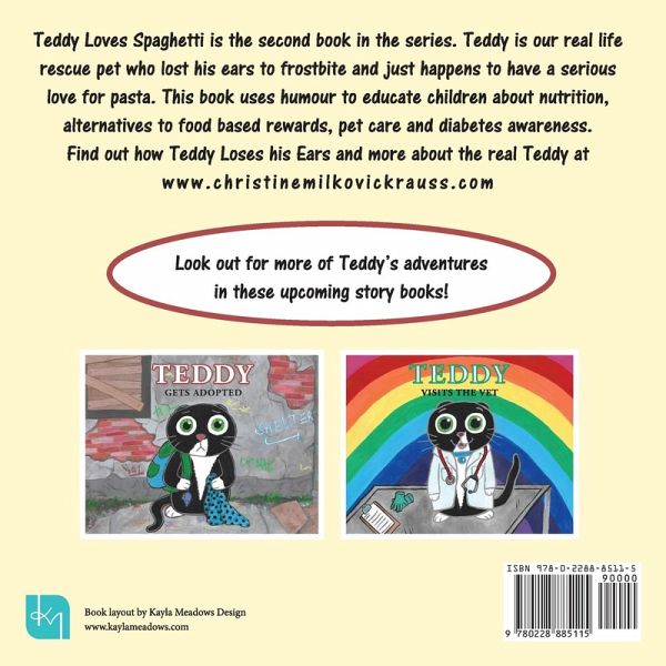 Teddy Loves Spaghetti is the second book in the series. Teddy is our real life rescue pet who lost his ears to frostbite and just happens to have a serious love for pasta. This book uses humour to educate children about nutrition, alternatives to food based rewards, pet care and diabetes awareness. Find out how Teddy Loses his Ears and more about the real Teddy at www.christinemilkovickrauss.com