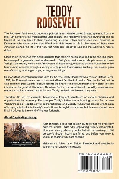 If you want to discover the captivating life of Teddy Roosevelt, then keep reading... The Roosevelt family would become a political dynasty in the United States, spanning from the late 19th century to the middle of the 20th century. The Roosevelt presence in America can be traced all the way back to their trail-blazing ancestor, Claes Martenszen van Roosevelt, a Dutchman who came to the New World with high hopes in 1644. Like many of those early American stories, the life of this very first American Roosevelt was one that went from rags to riches. Claes came to America with not much more than the shirt on his back, but in the ensuing years, he managed to generate considerable wealth. Teddy’s ancestor set up shop in a nascent New York (it was actually called New Amsterdam in those days), where he set the foundation for his future family’s wealth through a variety of enterprises that included banking, real estate, glass manufacturing, and sugar crops, among other things. So it was that several generations later, by the time Teddy Roosevelt was born on October 27th, 1858, the Roosevelts were one of the most affluent families in America. Despite the fact that he was born into great wealth, Teddy’s parents tried hard to make sure that their son didn’t take his inheritance for granted. His father, Theodore Senior, who was himself a wealthy businessman, made it a habit to make sure that his son Teddy realized how blessed they were. In Teddy Roosevelt: A Captivating Guide to the Life of Theodore Roosevelt Who Served as the 26th President of the United States of America, you will discover topics such as The Growing Pains of Teddy Roosevelt Tried, Tested, and Standing Firm The March toward War Teddy’s Return to Elected Office A Square Deal for Every Man The Panama Canal and a Bid for Reelection Two Weddings and a Second Term The Lead-Up to a Political Apocalypse Teddy’s Final Run and His River of Doubt A World War and a Worried Father And much, much more! So if you want to learn more about Teddy Roosevelt, scroll up and click the "add to cart" button!