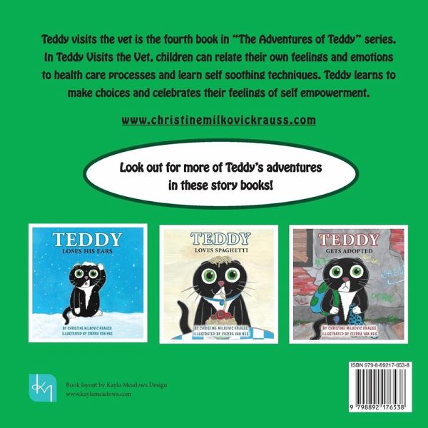 Teddy visits the vet is the fourth book in "The Adventures of Teddy" series. In Teddy Visits the Vet, children can relate their own feelings and emotions to health care processes and learn self soothing techniques. Teddy learns to make choices and celebrates their feelings of self empowerment. www.christinemilkovickrauss.com