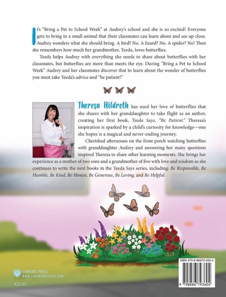 It's "Bring a Pet to School Week" at Audrey's school and she is so excited! Everyone gets to bring in a small animal that their classmates can learn about and see up close. Audrey wonders what she should bring. A bird? No. A lizard? No. A spider? No! Then she remembers how much her grandmother, Teeda, loves butterflies. Teeda helps Audrey with everything she needs to share about butterflies with her classmates, but butterflies are more than meets the eye. During "Bring a Pet to School Week" Audrey and her classmates discover that to learn about the wonder of butterflies you must take Teeda's advice and "be patient!"