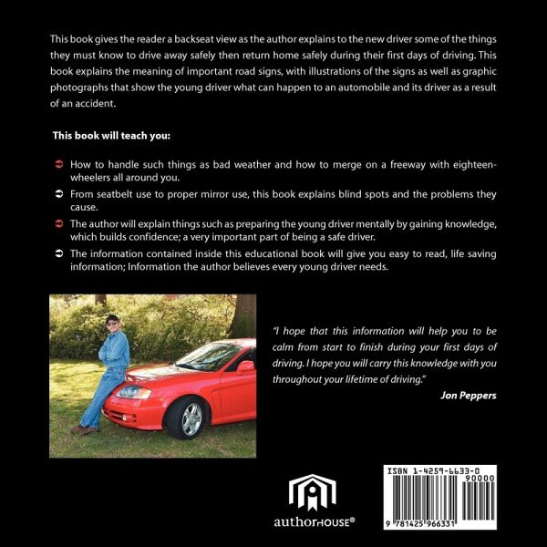 This book gives the reader a backseat view as the author explains to the new driver some of the things they must know to drive away safely then return home safely during their first days of driving. This book explains the meaning of important road signs, with illustrations of the signs as well as graphic photographs that show the young driver what can happen to an automobile and its driver as a result of an accident. This book will teach you: * How to handle such things as bad weather and how to merge on a freeway with eighteen-wheelers all around you. * From seatbelt use to proper mirror use, this book explains blind spots and the problems they cause. * The author will explain things such as preparing the young driver mentally by gaining knowledge, which builds confidence; a very important part of being a safe driver. *The information contained inside this educational book will give you easy to read, life saving information; Information the author believes every young driver needs. "I hope that this information will help you to be calm from start to finish during your first days of driving. I hope you will carry this knowledge with you throughout your lifetime of driving." Jon Peppers