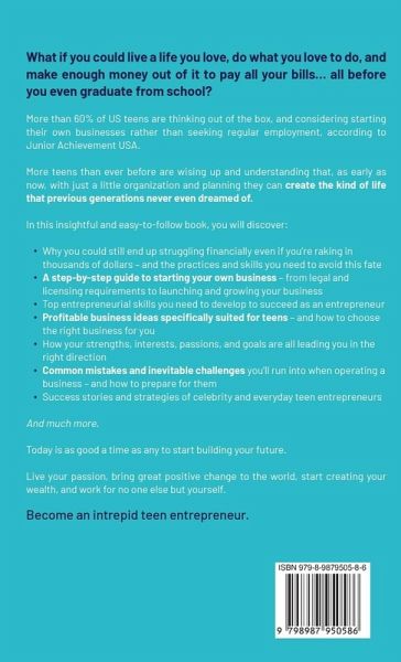 What if you could live a life you love, do what you love to do, and make enough money out of it to pay all your bills... all before you even graduate from school? Are you intrigued by the teen money success stories you keep hearing? There are so many opportunities for you to make money and you don't have to wait until you're an adult to get started. Becoming a success knows no age. Whether you're 15 or 65, making a fortune is open to you, There is no reason to believe that success and good fortune are limited only to adults, or that this has to happen in the old, traditional work-for-pay way. More than 60% of US teens are thinking out of the box, and considering starting their own businesses rather than seeking regular employment, according to Junior Achievement USA. More teens than ever before are wising up and understanding that, as early as now, with just a little organization and planning they can create the kind of life that previous generations never even dreamed of. In this insightful and easy-to-follow book, you will discover: ¿ Why you could still end up struggling financially even if you're raking in thousands of dollars - and the practices and skills you need to avoid this fate ¿ A step-by-step guide to starting your own business - from legal and licensing requirements to launching and growing your business ¿ Top entrepreneurial skills you need to develop to succeed as an entrepreneur ¿ Profitable business ideas specifically suited for teens - and how to choose the right business for you ¿ How your strengths, interests, passions, and goals are all leading you in the right direction ¿ Common mistakes and inevitable challenges you'll run into when operating a business - and how to prepare for them ¿ Success stories and strategies of celebrity and everyday teen entrepreneurs And much more. Taking your career and finances into your own hands does not need to start someday, when you "grow up". Today is as good a time as any to start building your future. Live your passion, bring great positive change to the world, start creating your wealth, and work for no one else but yourself.