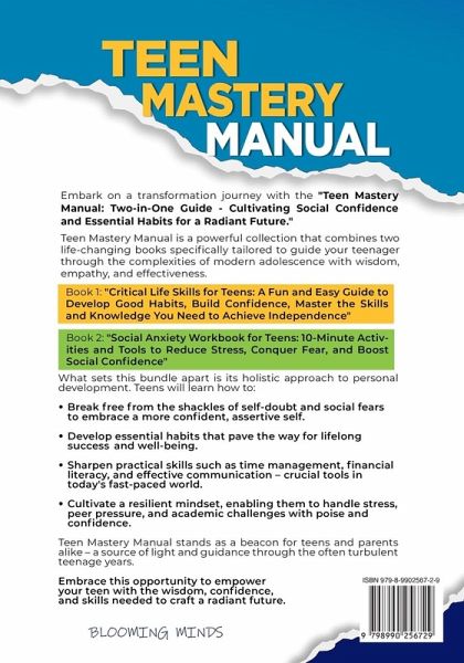 Unleash your teen's full potential in just weeks, even if they've been shackled by self-doubt, awkwardness, or poor habits for years...Are you a concerned parent watching your teenager wrestle with the trials of adolescence? Are daily battles with academic pressures, building meaningful friendships, or low self-confidence plaguing their precious teen years? You're not alone in this struggle - you've just found your teen's lifeline.Discover the ultimate roadmap to teenage triumph with the "Teen Mastery Manual: Two-in-one Collection - Cultivating Social Confidence and Essential Habits for a Radiant Future".This dynamic duo of books is your teen's secret weapon against the hurdles of adolescence, meticulously crafted to unlock their full potential.Critical Life Skills for Teens: A Fun and Easy Guide to Develop Good Habits, Build Confidence, Master the Skills and Knowledge You Need to Achieve Independence (Book 1) This engaging guide is a treasure trove of strategies to enhance self-confidence, conquer academic pressures, and master life skills for independence. It offers: Proven techniques to build resilient, positive mindsets amidst teenage challenges. Savvy financial literacy and budgeting tools for a head-start in financial independence. Practical communication skills to express themselves with authenticity and poise. Essential health and wellness advice, crucial in balancing academic and personal life. Decision-making and problem-solving skills for a well-rounded future. Time management techniques tailored for the busy, tech-savvy teen. Social Anxiety Workbook for Teens: 10-Minute Activities and Tools to Reduce Stress, Conquer Fear, and Boost Social Confidence (Book 2) This interactive workbook is a lifeline for teens struggling with social anxiety and peer pressure. It includes: 5 myths about self-compassion and why choosing to love yourself is one of the most influential decisions you can make. Understanding the profound impact of automatic thoughts on your mood and life satisfaction, and learning to cultivate a new mindfulness of your thought patterns. Fun and quick activities to boost social confidence and reduce stress. Insightful case studies and real-life examples to engage even the most reluctant readers and much more. "Teen Mastery Manual" is a comprehensive, two-in-one toolkit designed to meet the specific challenges faced by today's teens. Its relatable content, combined with exercises and interactive prompts, ensures an engaging, transformative experience for your teen. Whether your teen is battling self-doubt, seeking independence, or looking to forge stronger friendships, this manual is the key. Take Action Today!Make the crucial move today for the bright, confident, and fulfilled future your teen deserves - click "Add to Cart" button now!
