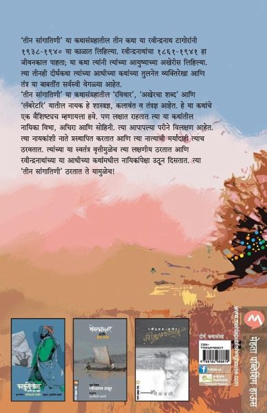 THE THREE STORIES, RAVIVAR, AKHERACHA SHABD AND LABORATORY, INCLUDED HEREIN WERE ORIGINALLY WRITTEN BY RABINDRANATH TAGORE DURING 1938-1940. CONSIDERING HIS LIFE-SPAN FROM 1861-1941, IT IS CLEAR THAT HE WROTE THEM AT THE END OF HIS LIFE. ALL THESE WERE LONG STORIES DIFFERING IN STYLE OF CARICATURES AND TECHNIQUES COMPARED TO HIS EARLIER WRITINGS. THE MAIN CHARACTERS FROM THESE STORIES ARE SCIENTIST, ARTIST AND TECHNICIAN WHICH IS QUITE REMARKABLE. YET, WHAT WE RECALL THE BEST ARE THE CHARACTERS OF WOMEN IN EACH STORY, VIBHA, ACHIRA AND SOHINI. ALL THESE THREE ARE EXCEPTIONAL IN THEIR OWN WAY. WHILE ESTABLISHING RELATION WITH THE MALES THEY DECIDE UPON ITS LIMITATION AS WELL. THEIR INDEPENDENT NATURE GIVES THEM UNIQUE IDENTITY WHICH IS WHY THE TRIO IS SO DIFFERENT FROM THE CHARACTERS IN RABINDRANATH TAGORE'S EARLIER STORIES, HENCE THE NAME 'TEEN SANGATINEE.'
