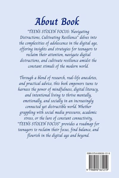 "TEENS STOLEN FOCUS'' Navigating Distractions, Cultivating Resilience" delves into the complexities of adolescence in the digital age, offering insights and strategies for teenagers to reclaim their attention, navigate digital distractions, and cultivate resilience amidst the constant stimuli of the modern world. Through a blend of research, real-life anecdotes, and practical advice, this book empowers teens to harness the power of mindfulness, digital literacy, and intentional living to thrive mentally, emotionally, and socially in an increasingly connected yet distractible world. Whether grappling with social media pressures, academic stress, or the lure of constant connectivity, "TEENS STOLEN FOCUS" provides a roadmap for teenagers to reclaim their focus, find balance, and flourish in the digital age and beyond
