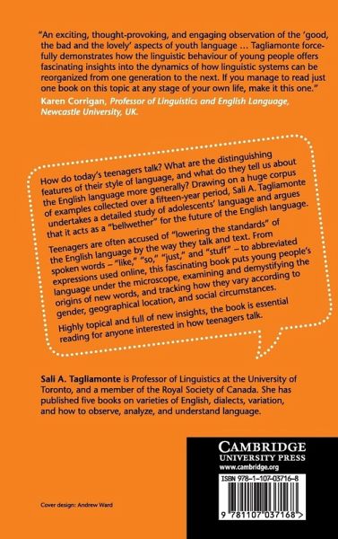 How do today's teenagers talk? What are the distinguishing features of their style of language, and what do they tell us about the English language more generally? Drawing on a huge corpus of examples collected over a fifteen-year period, Sali A. Tagliamonte undertakes a detailed study of adolescents' language and argues that it acts as a 'bellwether' for the future of the English language. Teenagers are often accused of 'lowering the standards' of the English language by the way they talk and text. From spoken words - 'like', 'so', 'just', and 'stuff' - to abbreviated expressions used online, this fascinating book puts young people's language under the microscope, examining and demystifying the origins of new words, and tracking how they vary according to gender, geographical location, and social circumstances. Highly topical and full of new insights, the book is essential reading for anyone interested in how teenagers talk.