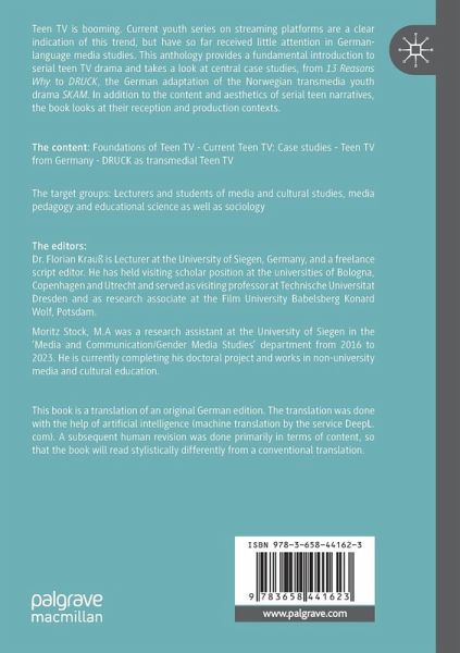 Teen TV is booming. Current youth series on streaming platforms are a clear indication of this, but have so far received little attention in German-language media studies. This anthology provides a fundamental introduction to serial teen TV and takes a look at central case studies, from 13 Reasons Why to DRUCK, the German adaptation of the Norwegian transmedia youth drama SKAM. In addition to the content and aesthetics of serial teen narratives, it looks at their reception and production contexts.