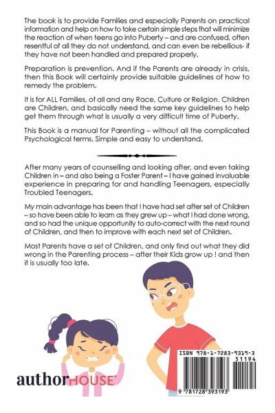 The book is to provide Families and especially Parents on practical information and help on how to take certain simple steps that will minimize the reaction of when teens go into Puberty ¿ and are confused, often resentful of all they do not understand, and can even be rebellious- if they have not been handled and prepared properly. Preparation is prevention. And if the Parents are already in crisis, then this Book will certainly provide suitable guidelines of how to remedy the problem. It is for ALL Families, of all and any Race, Culture or Religion. Children are Children, and basically need the same key guidelines to help get them through what is usually a very difficult time of Puberty. This Book is a manual for Parenting ¿ without all the complicated Psychological terms. Simple and easy to understand.