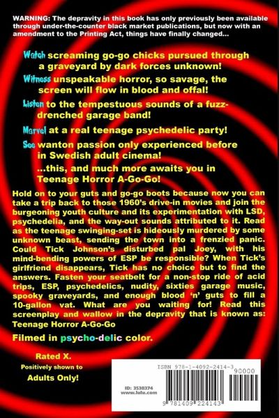 Hold on to your guts and go-go boots because now you can take a trip back to those 1960's drive-in movies and join the burgeoning youth culture and its experimentation with LSD, psychedelia, and the way-out sounds attributed to it. Read as the teenage swinging-set are hideously murdered by some unknown beast, sending the town into a frenzied panic. Could Tick Johnson's disturbed pal Joey, with his mind-bending powers of ESP be responsible? When Tick's girlfriend disappears, Tick has no choice but to find the answers. Fasten your seatbelt for a non-stop ride of psychedelic acid trips, ESP, go-go chicks, nudity, sixties garage rock, spooky graveyards, and enough blood 'n' guts to fill a 10-gallon vat. What are you waiting for! Read this screenplay and wallow in the depravity that is known as: Teenage Horror A-Go-Go. When you open this book, the gore will literally drop out onto your lap! You've been warned!