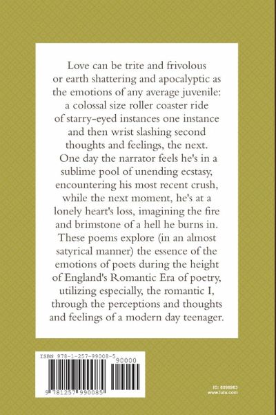 A book of verses exploring feelings and thoughts, highly emphasizing the sublime, the fantastical journey of self discovery, the Romantic 'I' and other notions of the Romantic Era, for a more modern day teenager.