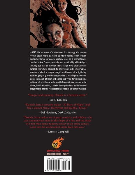 In 1795, the survivors of a murderous torture orgy at a remote French castle were attacked by rabid wolves. Badly bitten, Guillaume Garou surfaced a century later as a necrophagous cannibal in New Orleans, where he was recruited by white knights to carry out acts of atrocity and carnage. Now, after another hundred years have elapsed, he emerges as Billy Timberwolf, a shaman of electric corpse magick and leader of a lightning-addicted gang of graveyard shape-shifters, roaming the southern states in search of flesh and bones and vying for survival in a nightmarish grindhouse underworld of vampiric sex covens, serial killers, hellfire lunatics, sadistic bounty-hunters, acid-damaged circus freaks, and the resurrected spectres of his former masters. Illustrated by acclaimed and award-winning artist Daniele Serra, this new expanded and definitive edition of TEENAGE TIMBERWOLVES: LUST FOR LIGHTNING is printed in full-color, large-size format and includes the supplementary strip BLACK DEAD BONES OF IDIOT BILL, plus additional promotional art and text.