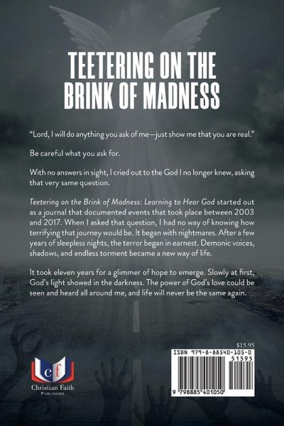 "Lord, I will do anything you ask of me--just show me that you are real." Be careful what you ask for. With no answers in sight, I cried out to the God I no longer knew, asking that very same question. Teetering on the Brink of Madness: Learning to Hear God started out as a journal that documented events that took place between 2003 and 2017. When I asked that question, I had no way of knowing how terrifying that journey would be. It began with nightmares. After a few years of sleepless nights, the terror began in earnest. Demonic voices, shadows, and endless torment became a new way of life. It took eleven years for a glimmer of hope to emerge. Slowly at first, God's light showed in the darkness. The power of God's love could be seen and heard all around me, and life will never be the same again.