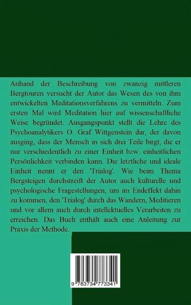 Anhand der Beschreibung von einundzwanzig mittleren Bergtouren versucht der Autor das Wesen des von ihm entwickelten Meditationsverfahrens zu vermitteln. Zum ersten Mal wird Meditation hier auf wissenschaftliche Weise begründet. Ausgangspunkt stellt die Lehre des Psychoanalytikers O. Graf Wittgenstein dar, der davon ausging, dass der Mensch in sich drei Teile birgt, die er nur verschiedentlich zu einer Einheit bzw. einheitlichen Persönlichkeit verbinden kann. Die letztliche und ideale Einheit nennt er den 'Trialog'. Wie beim Bergsteigen durchstreift der Autor alle möglichen kulturellen und psychologischen Fragestellungen, um im Endeffekt dahin zu kommen, den 'Trialog' durch das Wandern, Meditieren und intellektuelle Verarbeiten zu erreichen. Das Buch enthält auch eine Anleitung zur Praxis der Methode.