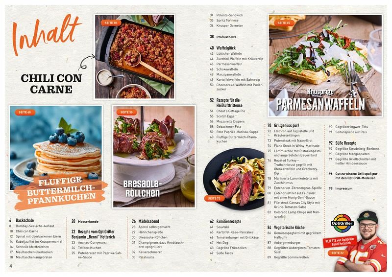 Grillgenuss pur!Endlich da: Das neue OptiGrill-Magazin!Kinder, was haben wir Euch vermisst! Neues Jahr - neues Grillglück und endlich wieder ein neues OptiGrill-Magazin! Und hier kommt auch schon eine große Portion Grillgenuss für Euch und Euren OptiGrill!Fleischgenuss pur oder Veggie-Lust, ob süß oder herzhaft - hier findet jeder neue Inspirationen und Kombinationen, die das Grillerlebnis erweitern und die gesamte Familie glücklich machen! Garantiert!Ob für die schnelle Mahlzeit zwischendurch oder das abendliche (Mädels-)Dinner - der OptiGrill überzeugt durch seine unkomplizierte Handhabung, die saubere Zubereitung und natürlich durch fantastische Ergebnisse. Unser Ziel ist es, Euch nicht nur mit köstlichen Rezepten zu inspirieren, sondern auch mit nützlichem Wissen rund ums Grillen zu versorgen. Lasst Euch von den vielen Möglichkeiten überraschen, die das Grillen zu bieten hat.Egal, ob Ihr ein Grillprofi oder ein Anfänger seid - mit diesen Rezepten werdet Ihr zu einem wahren Küchenhelden. Mit Rezeptideen, die inspirieren, aber vor allen Dingen auch funktionieren. Klappt den Opti auf und entdeckt, wie viel Spaß das Grillen in seinen vielfältigen Möglichkeiten machen kann. Denn Opti-Grillen ist mehr als nur eine Zubereitungsmethode - es ist ein Fest der Sinne.Wir wünschen Euch viel Freude beim Ausprobieren und Genießen!Euer Team vom OptiGrill-Magazin