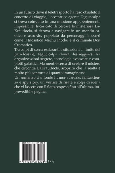 In un futuro dove il teletrasporto ha reso obsoleto il concetto di viaggio, l'eccentrico agente Tegucicalpa si trova coinvolto in una missione apparentemente impossibile. Incaricato di cercare la misteriosa LaKràudoclo, si ritrova a navigare in un mondo caotico e assurdo, popolato da personaggi bizzarri come il filosofico Machu Picchu e il criminale Don Cromatico.Tra colpi di scena esilaranti e situazioni al limite del paradossale, Tegucicalpa dovrà destreggiarsi tra organizzazioni segrete, tecnologie avanzate e complotti galattici. Ma mentre cerca di svelare il mistero che circonda LaKràudoclo, scoprirà che la realtà è molto più contorta di quanto immaginasse.Un romanzo che fonde humor surreale, fantascienza e spy story, un vortice di risate e colpi di scena che vi lascerà con il fiato sospeso fino all'ultima, imprevedibile pagina.