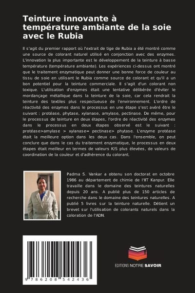 Il s'agit du premier rapport où l'extrait de tige de Rubia a été montré comme une source de colorant naturel utilisé en conjonction avec des enzymes. L'innovation la plus importante est le développement de la teinture à basse température (température ambiante). Les expériences ci-dessus ont montré que le traitement enzymatique peut donner une bonne force de couleur au tissu de soie en utilisant le Rubia comme source de colorant et qu'il a un bon potentiel pour la teinture commerciale. Il s'agit d'un colorant non toxique. L'utilisation d'enzymes était une tentative délibérée d'éviter le mordançage métallique dans la teinture de la soie, car cela rendrait la teinture des textiles plus respectueuse de l'environnement. L'ordre de réactivité des enzymes dans le processus en une étape s'est avéré être le suivant : protéase, phytase, xylanase, amylase, pectinase. De même, pour le processus de teinture en deux étapes, l'ordre de réactivité des enzymes dans le processus en deux étapes observé est le suivant : protéase>amylase > xylanase= pectinase> phytase. L'enzyme protéase était la meilleure option dans les deux cas. Dans l'ensemble, on peut conclure que dans le cas du traitement enzymatique, le processus en deux étapes était meilleur en termes de valeurs K/S plus élevées, de valeurs de coordination de la couleur et d'adhérence du colorant.