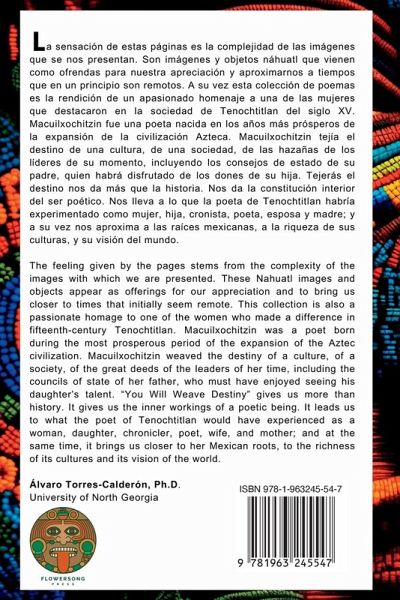 Traveling and being transported to another place means experiencing different seasons and times. It is an essential part of Xánath Caraza's poetry. The feeling given by the pages of You Will Weave Destiny stems from the complexity of the images with which we are presented. These Nahuatl images and objects appear as offerings for our appreciation and to bring us closer to times that initially seem remote. This collection is also a passionate homage to one of the women who made a difference in fifteenth century Tenochtitlan. Macuilxochitzin or Macuilxochitl was a poet born during the most prosperous period of the expansion of the Aztec civilization. Daughter of the royal advisor Tlacaelel and niece of the Tlatoani warrior Axayacatl. Her life and her texts are an example of the gender parallelism of pre-Hispanic Mexico where women had the same opportunities as men.