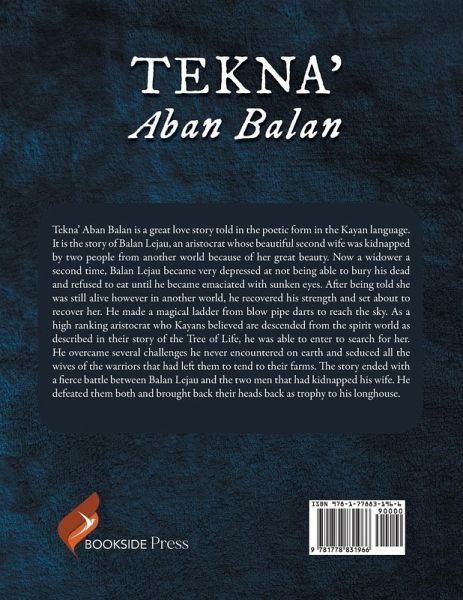 Tekna' Aban Balan is a great love story told in the poetic form in the Kayan language. It is the story of Balan Lejau, an aristocrat whose beautiful second wife was kidnapped by two people from another world because of her great beauty. Now a widower a second time, Balan Lejau became very depressed at not being able to bury his dead and refused to eat until he became emaciated with sunken eyes. After being told she was still alive however in another world, he recovered his strength and set about to recover her. He made a magical ladder from blow pipe darts to reach the sky. As a high ranking aristocrat who Kayans believed are descended from the spirit world as described in their story of the Tree of Life, he was able to enter to search for her. He overcame several challenges he never encountered on earth and seduced all the wives of the warriors that had left them to tend to their farms. The story ended with a fierce battle between Balan Lejau and the two men that had kidnapped his wife. He defeated them both and brought back their heads back as trophy to his longhouse.