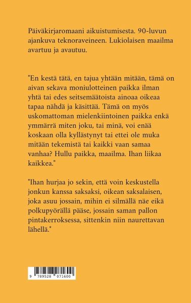 Päiväkirjaromaani aikuistumisesta. 90-luvun ajankuva teknoraveineen. Lukiolaisen maailma avartuu ja avautuu. "En kestä tätä, en tajua yhtään mitään, tämä on aivan sekava moniulotteinen paikka ilman yhtä tai edes seitsemäätoista ainoaa oikeaa tapaa nähdä ja käsittää. Tämä on myös uskomattoman mielenkiintoinen paikka enkä ymmärrä miten joku, tai minä, voi enää koskaan olla kyllästynyt tai ettei ole muka mitään tekemistä tai kaikki vaan samaa vanhaa? Hullu paikka, maailma. Ihan liikaa kaikkea." "Ihan hurjaa jo sekin, että voin keskustella jonkun kanssa saksaksi, oikean saksalaisen, joka asuu jossain, mihin ei silmällä näe eikä polkupyörällä pääse, jossain saman pallon pintakerroksessa, sittenkin niin naurettavan lähellä."