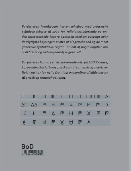 Forfatteren fremlægger her en tekstbog med oldgræske religiøse tekster til brug for religionsstuderende og andre interesserede læsere sammen med en oversigt over de vigtigste bøjningsmønstre af oldgræske ord og de mest generelle syntaktiske regler, indledt af nogle kapitler om ordklasser og sætningsanalyse generelt.