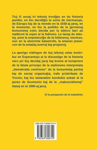 Postparolo de la tradukinto Tiuj ¿i unuaj tri tekstoj trovi¿as en tiu historia punkto, en kiu decidi¿is la sorto de Germanujo, de E¿ropo kaj de la mondo en la 1930-aj jaroj, en la momento, en kiu la politiko de la germanaj komunistoj estis decida por la ebleco bari ä malfermi la vojon al la fäismo. La lastaj du tekstoj, post la enpotenci¿o de la hitleranoj, montras, nun en la alveninta katastrofo, la amaran pravecon de la antäaj avertoj kaj proponoj. La fatala decido pritrakti la socialdemokratan partion kiel socialfäisman kaj deklari ¿in la unua malamiko, decido trudita de la Komunista Internacio dominata de Stalino, sed akceptita de la germana komunista partio, siavice gvidata de stalinistoj, efektive faciligis la enpotenci¿on de la fäistoj kaj pere de ili la Duan Mondmiliton kun ¿iaj teruräoj. Sed ekzistis komunistoj kiuj solidare kritikis tiun fatalan kurson kaj faris koherajn proponojn de alternativa politiko, kies realigo ja povintus bari la vojon al la fäistoj. La du tekstoj de Leo Trocko en tiu ¿i libreto estas ekzemploj de tio. Sed, ¿ar la decidantaj stalinistoj anatemis Trockon kaj la maldekstran opozicion, al kiu li apartenis, liaj avertoj kaj liaj proponoj e¿ ne estis ädataj kaj e¿ hodiä, pro la däre efikanta anatemo, inter la vicoj de la t.n. „ortodoksa" komunismo, estas ne konataj, ¿ar sisteme ignorataj. Nuntempe, ¿efe en Ruslando, sed ne nur tie, la nostalgiuloj de Stalino pentras tiun ¿i homon kiel la gloran venkinton super la fäismo, kompreneble sen mencii ä e¿ sen scii, ke la politiko de Stalino kaj de liaj obeemaj adeptoj en Germanujo grave kontribuis al la venko de la fäismo en tiu centre¿ropa lando kaj per tio al ties agreso al Sovetunio, konträ kiu la sovetiaj popoloj devis defendi sin en katastrofe detrua kaj mortiga milito. La aperigo nialingve de tiuj tekstoj celas kontribui al la disvastigo de la historia vero pri tiuj decidaj jaroj kaj krome al kompreno de la fatala principo de la stalinisme interpretata „demokratia centralismo" de la komunistaj partioj kaj de sociaj organizäoj, trafe priskribata de Trocko kaj kiu lastanalize kondukis ankä al la pereo de Soventunio kaj de la „realsocialismaj" ¿tatoj en la 1990-aj jaroj. Havano, oktobre de 2016, Vilhelmo Lutermano