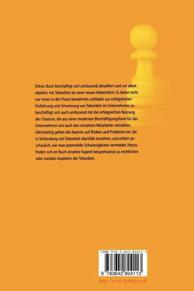 Dieses Buch beschäftigt sich umfassend, detailliert und vor allem objektiv mit Telearbeit als einer neuen Arbeitsform. Es bietet nicht nur einen in der Praxis bewährten Leitfaden zur erfolgreichen Einführung und Umsetzung von Telearbeit in das Unternehmen, es beschäftigt sich auch umfassend mit der erfolgreichen Nutzung der Chancen, die aus einer modernen Beschäftigungsform für das Unternehmen wie auch den einzelnen Mitarbeiter entstehen. Gleichzeitig gehen die Autoren aber auch auf Risiken und Probleme ein, die in Verbindung mit Telearbeit ebenfalls bestehen, und erklärt anschaulich, wie man potentielle Schwierigkeiten vermeidet. Hierzu finden sich im Buch einzelne Kapitel beispielsweise zu rechtlichen oder sozialen Aspekten der Telearbeit.