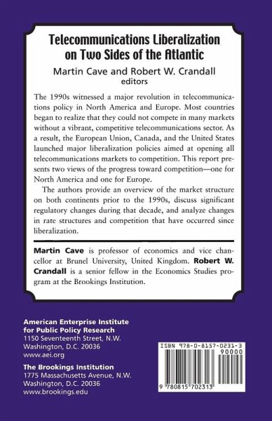 Martin Cave is a regulatory economist specialising in the network industries, including airports, broadcasting, energy, posts, railways, telecommunications and water. Previously, he held the BP Centennial Chair at the London School of Economics. Robert W. Crandall is a senior fellow in the Economic Studies program at the Brookings Institution, where his research has focused on telecommunications and cable television regulation, industrial organization and policy, and the changing regional structure of the U.S. economy. His previous books include "Broadband: Should We Regulate Internet Access?" (Brookings, 2002), "Telecommunications Liberalization on Two Sides of the Atlantic" (Brookings, 2001) and "Who Pays for Universal Service?" (Brookings, 2000).