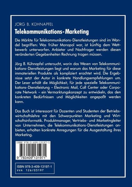 Der Leser erhält die Möglichkeit, für jede spezielle Telekommunikations-Dienstleistung - Electronic Mail, Call Center oder Corporate Network - ein Vermarktungskonzept zu entwickeln, das den konkreten Bedürfnissen und Möglichkeiten angepaßt werden kann.
