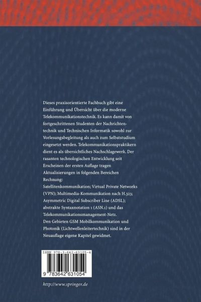 1 Historie, Bestandsaufnahme Und Ausblick.- 1.1 Eine kurze Geschichte der Fernsprechtechnik.- 1.2 Information, Dienste, Kommunikation, Netze.- 1.3 Sprachdigitalisierung und Zeitmultiplex.- 1.4 Klassische Dienste öffentlicher Netze.- 1.5 Internet.- 1.6 Mobilfunk.- 1.7 Satellitenkommunikation.- 1.8 Das Intelligente Netz (Intelligent Network; IN).- 2 Das Referenzmodell FÜr Offene Systeme (Open Systems Interconnection; OSI).- 2.1 Einführung in das OSI-Referenzmodell.- 2.2 Die ITU-T-Spezifikationen der X.200-Serie.- 2.3 Strukturierung von Kommunikationsbeschreibungen.- 2.4 Anwendungsbereiche des OSI-RM, Prozesse.- 2.5 Konzept der geschichteten Architektur.- 2.6 Die sieben OSI-Schichten.- 3 Die Itu-T-Spezifikationssprache SDL Und Die ISO-Netzprogrammiersprache ASN.1.- 3.1 Einführung in SDL.- 3.2 SDL-Struktur-Konzept.- 3.3 Ergänzende Dokumente zu SDL.- 3.4 Abstrakte Syntax Notation Eins (ASN.1).- 4 Das Diensteintegrierende Digitale Netz (Integrated Services Digital Network; ISDN).- 4.1 Einführung in das ISDN.- 4.2 Physikalische Schicht der ISDN-Teilnehmerschnittstellen.- 4.3 Sicherungsschicht des D-Kanals der ISDN-Teilnehmerschnittstellen; LAPD.- 4.4 Vermittlungsschicht des D-Kanals der ISDN-Teilnehmerschnittstellen.- 5 Hardware-Controller (Telecom-ICs)*FÜr Die Unteren Isdn-Schichten.- 5.1 Diskussion von Hardware- und Software-Realisierungen.- 5.2 Grundstruktur von Vermittlungssystemen.- 5.3 Übersicht über die ICs der Siemens-IOM®-Familie.- 5.4 Schnittstellen.- 5.5 Übersicht über einige wichtige IOM®-ICs.- 5.6 Beispiel für einen kommenden ISDN-Verbindungsaufbau über ISDN-ICs.- 5.7 Auswahlkriterien für ISDN-ICs.- 6 Nutzkanal-Dienste Und Internet.- 6.1 Übersicht.- 6.2 Paketvermittlung über X.25.- 6.3 Internet.- 6.4 Message Handling Systems (MHS) nach X.400.-6.5 Verzeichnis (Directory) nach X.500.- 6.6 File Transfer, Access and Management (FTAM).- 6.7 APPLI/COM und CAPI.- 7 Zentralkanal-Zeichengabesystem ZGS#7 und Telekommunikations-Management-NETZ TMN.- 7.1 Übersicht über das ZGS#7.- 7.2 Die Ebenen des ZGS#7.- 7.3 Telekommunikations-Management-Netz (TMN).- 7.4 Das Siemens-Vermittlungssystem EWSD.- 8 Lokale Netze (Local Area Networks; LANs).- 8.1 Übersicht.- 8.2 Ethernet und IEEE 802.3-LANs.- 8.3 Token Ring und IEEE 802.5-LANs.- 8.4 Distributed Queue Dual Bus (DQDB) und IEEE 802.6-LANs.- 8.5 Fiber Distributed Data Interface (FDDI).- 8.6 LAN-Netzkopplung.- 9 Asynchronous Transfer Mode (ATM) und Zubringer-Breitbandtechniken.- 9.1 Einführung in ATM.- 9.2 ATM-Zellen.- 9.3 VP/VC-basierte ATM-Vermittlungstechnik.- 9.4 Das ATM-Referenzmodell.- 9.5 ATM-Schnittstellen.- 9.6 Synchrone Digitale Hierarchie (SDH) als ATM-Träger.- 9.7 ATM-LANs.- 9.8 Switched Multi Megabit Data Service (SMDS).- 9.9 Frame-Relay als ATM-Zubringer.- 9.10 Asymmetric Digital Subscriber Line (ADSL).- 10 Global System For Mobile Communications (GSM).- 10.1 Einführung in das GSM.- 10.2 Systemarchitektur.- 10.3 Telekommunikationsdienste.- 10.4 Adressierung und Sicherheitsdienste.- 10.5 Funkschnittstelle Um.- 10.6 Codierung.- 10.7 Telecom ICs für GSM.- 11 Photonik.- 11.1 Einführung.- 11.2 Sendedioden LED und LD.- 11.3 Empfangsdioden pin und APD.- 11.4 Lichtwellenleiter.- 11.5 Systeme.- 11.6 Ausblick auf die weltweite Entwicklung.- Sach- und Abkürzungsverzeichnis.