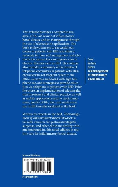 Written by experts in the field, Telemanagement of Inflammatory Bowel Disease is a valuable resource for gastroenterologists, surgeons, a nd other clinicians dealing with, and interested in, this novel adjunct to routine care for inflammatory bowel disease.