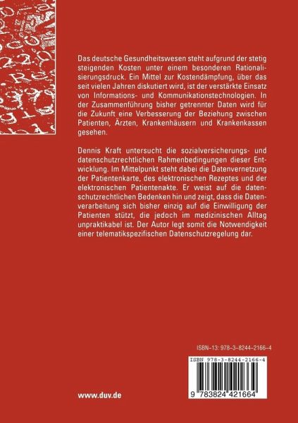 Dennis Kraft untersucht die sozialversicherungs- und datenschutzrechtlichen Rahmenbedingungen dieser Entwicklung. Im Mittelpunkt steht dabei die Datenvernetzung der Patientenkarte, des elektronischen Rezeptes und der elektronischen Patientenakte. Er weist auf die datenschutzrechtlichen Bedenken hin und zeigt, dass die Datenverarbeitung sich bisher einzig auf die Einwilligung der Patienten stützt, die jedoch im medizinischen Alltag unpraktikabel ist. Der Autor legt somit die Notwendigkeit einer telematikspezifischen Datenschutzregelung dar.