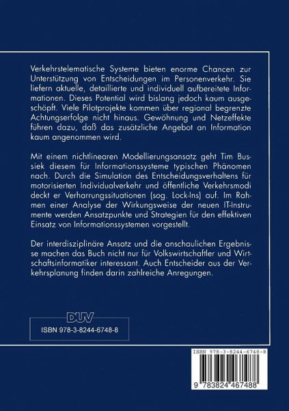 Verkehrstelematische Systeme bieten enorme Chancen zur Unterstützung von Entscheidungen im Personenverkehr. Sie liefern aktuelle, detaillierte und individuell aufbereitete Informationen. Dieses Potential wird bislang jedoch kaum ausgeschöpft. Viele Pilotprojekte kommen über regional begrenzte Achtungserfolge nicht hinaus. Gewöhnung und Netzeffekte führen dazu, daß das zusätzliche Angebot an Information kaum angenommen wird. Mit einem nichtlinearen Modellierungsansatz geht Tim Bussiek diesem für Informationssysteme typischen Phänomen nach. Durch die Simulation des Entscheidungsverhaltens für motorisierten Individualverkehr und öffentliche Verkehrsmodi deckt er Verharrungssituationen (sog. Lock-Ins) auf. Im Rahmen einer Analyse der Wirkungsweise der neuen IT-Instrumente werden Ansatzpunkte und Strategien für den effektiven Einsatz von Informationssystemen vorgestellt.