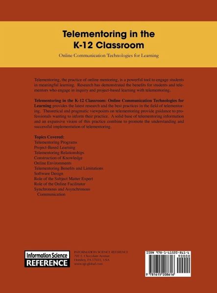 Telementoring, the practice of online mentoring, is a powerful tool to engage students in meaningful learning. Research has demonstrated the benefits for students and telementors who engage in inquiry and project-based learning with telementoring. Telementoring in the K-12 Classroom: Online Communication Technologies for Learning provides the latest research and the best practices in the field of telementoring. Theoretical and pragmatic viewpoints on telementoring provide guidance to professionals wanting to inform their practice. A solid base of telementoring information and an expansive vision of this practice combine to promote the understanding and successful implementation of telementoring.
