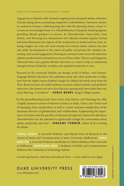 Yoga gurus on lifestyle cable channels targeting time-pressured Indian urbanites; Chinese dating shows promoting competitive individualism; Taiwanese domestic makeover formats combining feng shui with life planning advice: Asian TV screens are increasingly home to a wild proliferation of popular factual programs providing lifestyle guidance to viewers. In Telemodernities Tania Lewis, Fran Martin, and Wanning Sun demonstrate how lifestyle-oriented popular factual television illuminates key aspects of late modernities in South and East Asia, offering insights not only into early twenty-first-century media cultures but also into wider developments in the nature of public and private life, identity, citizenship, and social engagement. Drawing on extensive interviews with television industry professionals and audiences across China, India, Taiwan, and Singapore, Telemodernities uses popular lifestyle television as a tool to help us understand emergent forms of identity, sociality, and capitalist modernity in Asia.