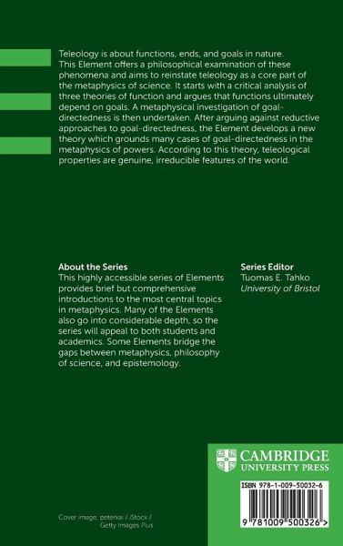 Teleology is about functions, ends, and goals in nature. This Element offers a philosophical examination of these phenomena and aims to reinstate teleology as a core part of the metaphysics of science. It starts with a critical analysis of three theories of function and argues that functions ultimately depend on goals. A metaphysical investigation of goal-directedness is then undertaken. After arguing against reductive approaches to goal-directedness, the Element develops a new theory which grounds many cases of goal-directedness in the metaphysics of powers. According to this theory, teleological properties are genuine, irreducible features of the world.