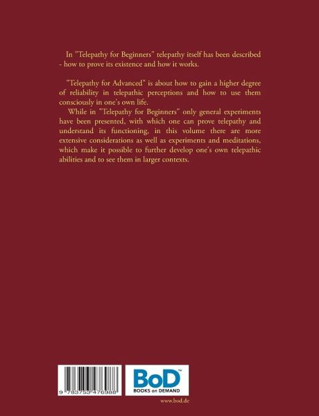 In "Telepathy for Beginners" telepathy itself has been described - how to prove its existence and how it works. "Telepathy for Advanced" is about how to gain a higher degree of reliability in telepathic perceptions and how to use them consciously in one's own life. While in "Telepathy for Beginners" only general experiments have been presented, with which one can prove telepathy and understand its functioning, in this volume there are more extensive considerations as well as experiments and meditations, which make it possible to further develop one's own telepathic abilities and to see them in larger contexts.