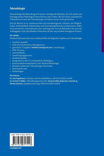 DIN-Normen,Arbeitsabläufe,Genehmigungsprozess,Qualitätsaspekte,Integration in die IT-Landschaft der Beteiligten,Kommunikationsstandards in der Medizin/Radiologie,Beispiele realisierter Teleradiologie-Netzwerke,Datenschutz undRechtsfragen .