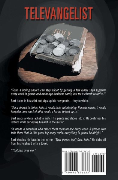 Wearing a tailored suit and holding a bible, Bart Baxter walks out of prison with one goal in mind--to make money and lots of it. Follow along as Bart exploits religion and manipulates his followers for personal gain. Question your own moral code as you're drawn into Bart's world. Meet Mrs Christianson, Bishop Ronny, Mitch the Finance Guy, Bassist Joey and other memorable characters. Humor. Suspense. Televangelist. From the back cover: "Sure, a boring church can stay afloat by getting a few lonely saps together every week to gossip and exchange business cards, but for a church to thrive?" Bart tucks in his shirt and zips up his new pants—they’re white. "For a church to thrive, Julie, it needs to be entertaining. It needs music, it needs laughter, and most of all it needs a leader to look up to." Bart grabs a white jacket to match his pants and slides into it. He continues his lecture while surveying himself in the mirror. "It needs a shepherd who offers them reassurance every week. A person who tells them that in this great big scary world, everything is gonna be alright." Bart studies his face in the mirror. "That person isn’t God, Julie." He dabs oil from his forehead with a towel. "That person is me."