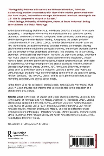 Television Brandcasting examines U. S. television's utility as a medium for branded storytelling. It investigates the current and historical role that television content, promotion, and hybrids of the two have played in disseminating brand messaging and influencing consumer decision-making. Juxtaposing the current period of transition with that of the 1950s-1960s, Jennifer Gillan outlines how in each era new technologies unsettled entrenched business models, an emergent viewing platform threatened to undermine an established one, and content providers worried over the behavior of once-dependable audiences. The anxieties led to storytelling, promotion, and advertising experiments, including the Disneyland series, embedded rock music videos in Ozzie & Harriet, credit sequence brand integration, Modern Family's parent company promotion episodes, second screen initiatives, and social TV experiments. Offering contemporary and classic examples from the American Broadcasting Company, Disney Channel, ABC Family, and Showtime, alongside series such as Bewitched, Leave it to Beaver, Laverne & Shirley, and Pretty Little Liars, individual chapters focus on brandcasting at the level of the television series, network schedule, "Blu-ray/DVD/Digital" combo pack, the promotional short, the cause marketing campaign, and across social media. In this follow-up to her successful previous book, Television and New Media: Must-Click TV, Gillan provides vital insights into television's role in the expansion of a brand-centric U.S. culture.